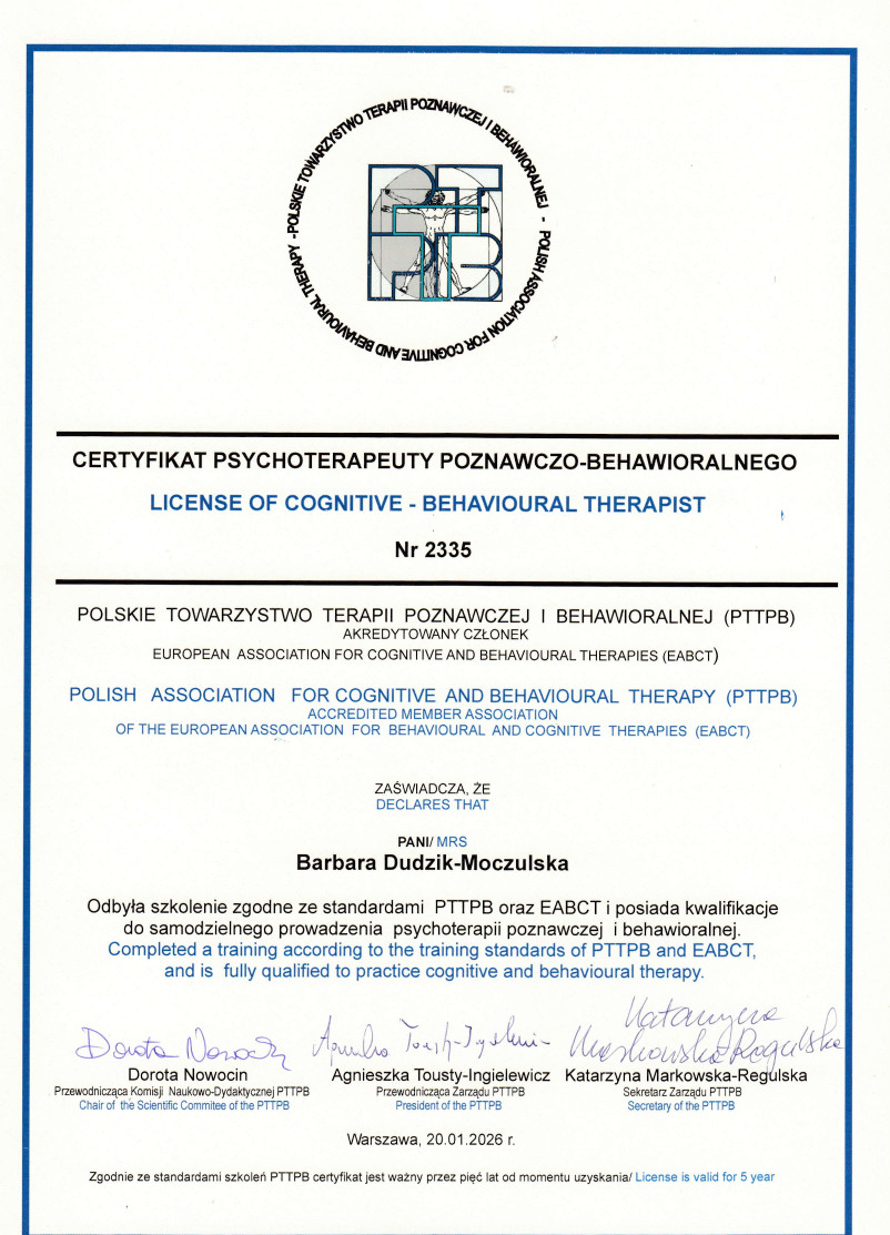 Jestem psycholożką z ponad 20-letnim doświadczeniem zawodowym, certyfikowaną psychoterapeutką poznawczo – behawioralną (nr certyfikatu 2335) i specjalistką psychoterapii uzależnień (nr certyfikatu SP/1308/2017). W swojej codziennej pracy korzystam z metod mających naukowo udowodnioną skuteczność. Pracuję z osobami zmagającymi się m. in. zaburzeniami nastroju, zaburzeniami lękowymi, zaburzeniami obsesyjno-kompulsyjnymi, zaburzeniami osobowości, uzależnieniemi, trudnościami emocjonalnymi, kryzysami życiowymi, będących w spektrum ADHD, spektrum autyzmu. Bliska jest mi tzw. trzecia fala terapii poznawczo- behawioralnej, prowadząc terapię czerpię z nurtu Mindfulness, Terapii Akceptacji i Zaangażowania (ACT) oraz Terapii Dialektyczno- Behawioralnej. Szczególnie ważne jest dla mnie budowanie relacji opartej na zaufaniu oraz wzmacnianie poczucia sprawczości i własnej skuteczności u osób, które zgłaszają się po pomoc. Swoją pracę poddaję regularnej superwizji.