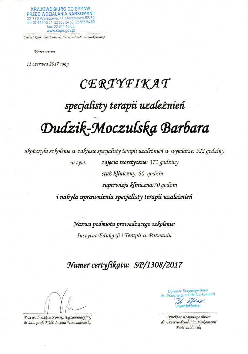 Studia psychologiczne o specjalności psychologia kliniczna ukończyłam na Uniwersytecie Wrocławskim w 2002 r. Stale podnoszę swoje kwalifikacje uczestnicząc w szkoleniach specjalistycznych, kursach oraz konferencjach naukowych. Ukończyłam Studium Terapii i Rehabilitacji Uzależnienia od Narkotyków realizowane przez Instytut Edukacji i Terapii w Poznaniu i w 2017 r. uzyskałam certtyfikat specjalisty psychoterapii uzależnień wydany przez Krajowe Biuro ds. Przeciwdziałania Narkomanii. Ukończyłam również czteroletnią Szkołę Psychoterapii Poznawczo- Behawioralnej Uniwersytetu SWPS w Poznaniu pod kierownictwem dr hab. Agnieszki Popiel i dr Ewy Pragłowskiej, uzyskałam certyfikat psychoterapeuty poznawczo-behawioralnego Polskiego Towarzystwa Terapii Poznawczej i Behawioralnej. Ponadto odbyłam podstawowy oraz zaawansowany kurs Interwencji Kryzysowej w łącznym wymiarze 470 godzin.